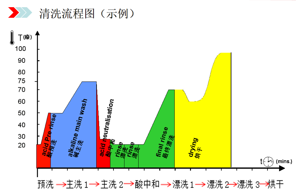 3、中和清洗:進(jìn)自來水,進(jìn)入酸性清洗劑,一般清洗溫度45-80攝氏度;